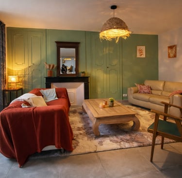 Le salon est spacieux et lumineux, idéal pour se retrouver après une journée de balade. Il offre un espace confortable pour se détendre, lire ou partager des moments conviviaux en famille ou entre amis.
